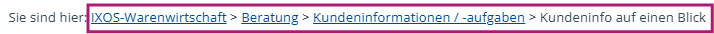 In der Breadcrumb-Navigation in der obersten Zeile jeder Hilfeseite können Sie ablesen, wo Sie sich im Moment innerhalb der Hilfe befinden. Jeder Eintrag ist zugleich ein Link, so dass Sie per Mausklick zu jedem der übergeordneten Themen wechseln können.