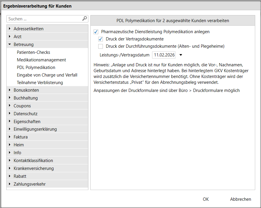 Ab sofort können Sie in den Reports für ermittelte Kandidaten per Ergebnisverarbeitung die pharmazeutische Dienstleistung Polymedikation anlegen. Optional können die Vertragsdokumente und/oder die Durchführungsdokumente auch direkt gedruckt werden.