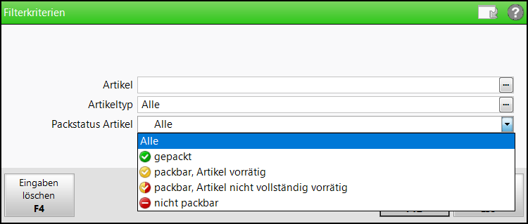 Sie können über Filtern - F4 die Anzeige der zu packenden Positionen filtern. Im Fenster Filterkriterien stehen Ihnen folgende Filtermöglichkeiten zur Auswahl: