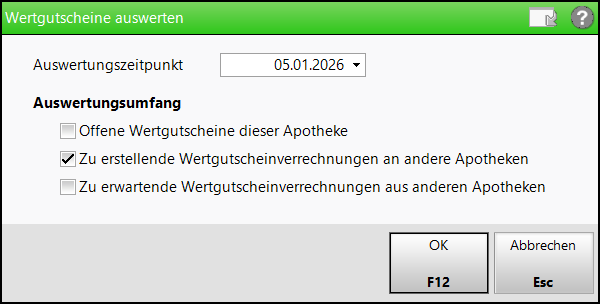 Markieren Sie die Checkbox Offene Wertgutscheine dieser Apotheke und bestätigen Sie mit OK – F12.
