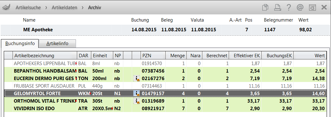 : Zeigt, dass ein Angebotspreis gebucht wurde. - EK: Zeigt den Buchungs-EK der Packung.