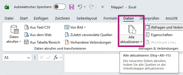 Wenn keine automatische Aktualisierung eingestellt wurde, können Sie mit Daten > Alle aktualisieren die Daten aktualisieren.