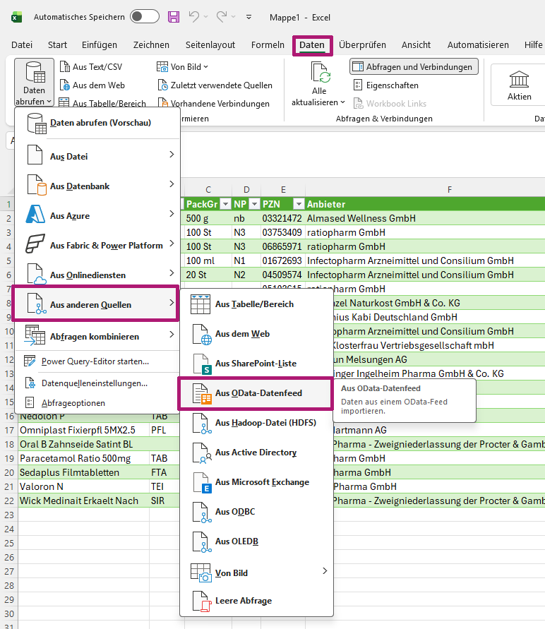 Wählen Sie Daten abrufen > Aus anderen Quellen > Aus OData-Datenfeed.