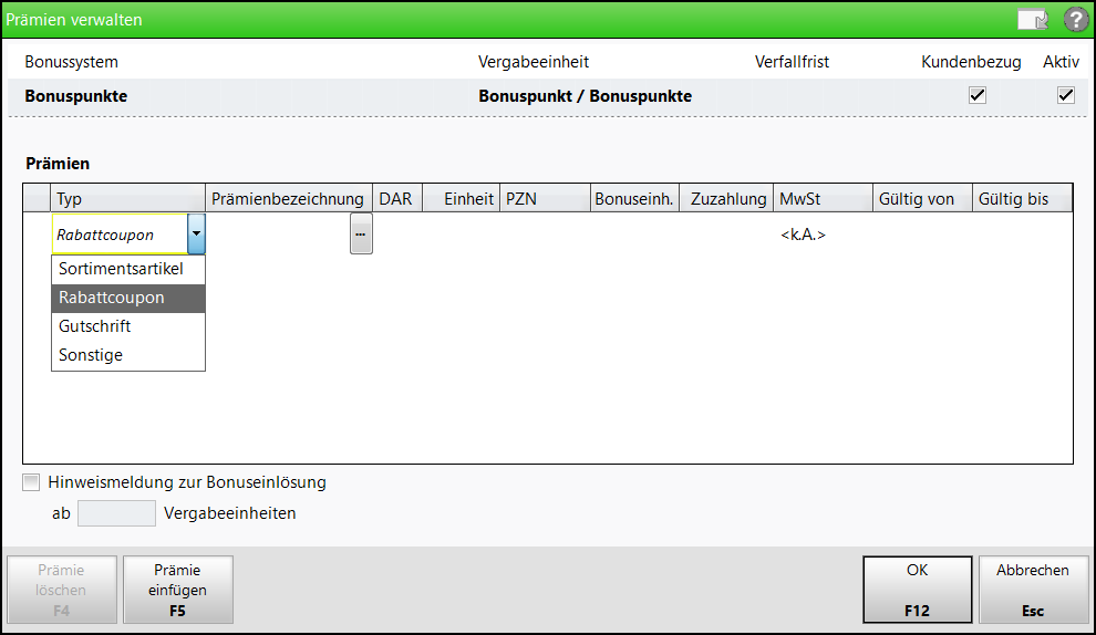 Aktivieren Sie die Checkbox nur als Prämie einlösbar, wenn eine Erfassung des Rabattcoupons im Verkauf nur im Rahmen einer Bonusprämieneinlösung möglich sein soll.