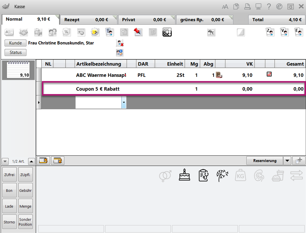 Der Coupon wird als Barverkaufsposition „Coupon“ mit VK 0,00 € ins Subtotal übernommen.