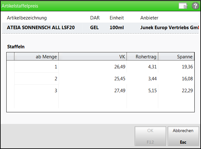 Das Fenster Artikelstaffelpreis öffnet sich und zeigt die Staffelpreise mit VK, Rohertrag und Spanne an.