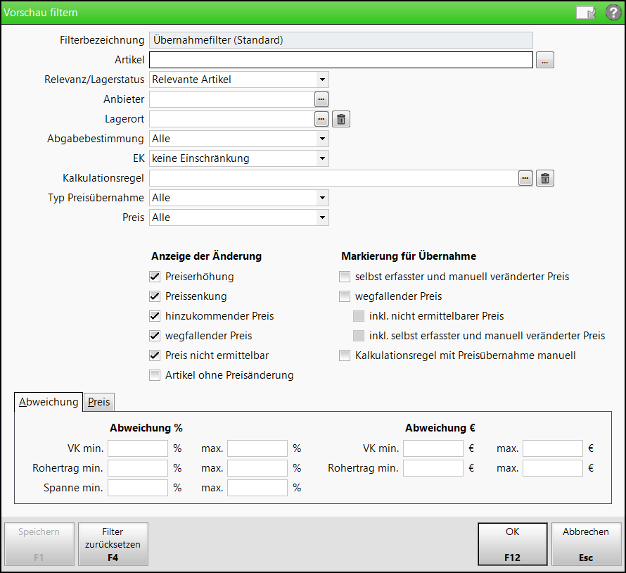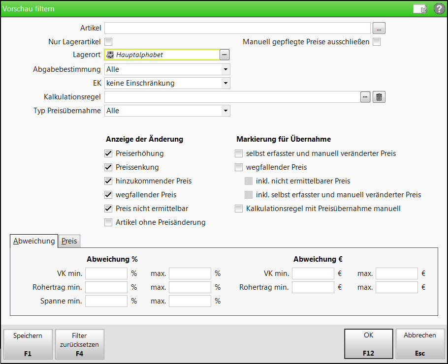 Um die Anzeige in der Vorschau (und damit eine mögliche Preisübernahme) vorübergehend einzuschränken, geben Sie die gewünschten Filterkriterien ein und bestätigen die Eingabe mit OK - F12.