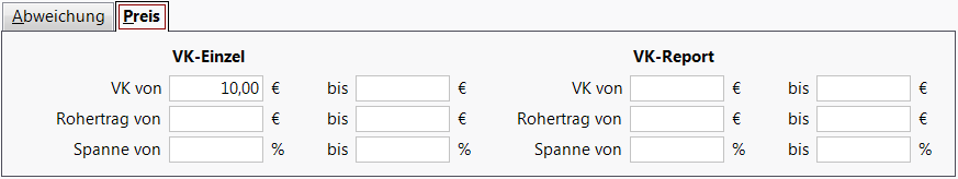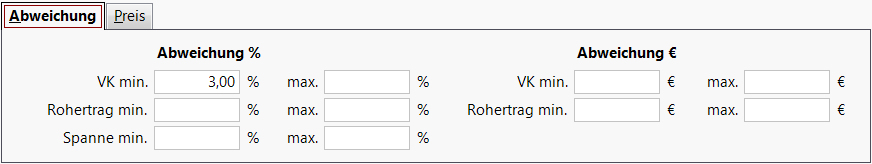 - Register Abweichung - Geben Sie die minimale (min.) und die maximale (max.) Differenz des aktuellen zum neu berechneten Preis in % und/oder in € für den VK, der Rohertrag und/oder die Spanne ein. Es werden dann nur Artikel mit dieser Preisdifferenz angezeigt.