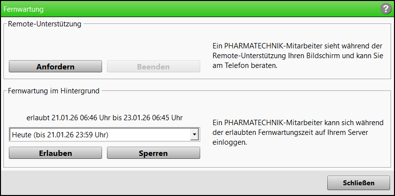 - Klicken Sie unter Fernwartung auf Erlauben.Für den freigegebenen Zeitraum hat ein PHARMATECHNIK-Mitarbeiter Zugriff auf Ihr System, um das gemeldete Problem zu beheben.