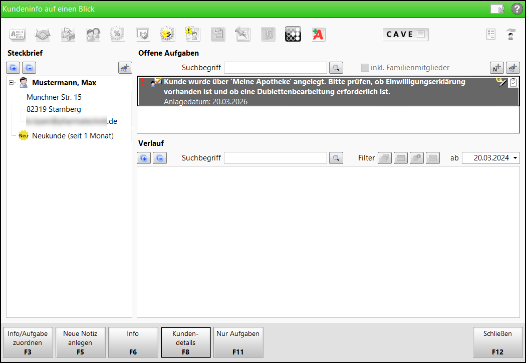 Beim Erfassen eines Verkaufs an der Kasse oder in der Faktura für den Kunden wird ein Meldungstext und bei vorhandener IXOS.Kunde-Lizenz und aktivierter Kundeninfo auf einen Blick eine Aufgabe im Fenster Kundeninfo auf einen Blick automatisch angezeigt. Auf diesem Weg erinnert Sie das System an die erforderliche Prüfung auf das Vorliegen einer Einwilligungserklärung und auf Dublettenbearbeitungsbedarf.